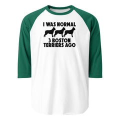 I Was Normal 3 Boston Terriers Ago 3/4 Sleeve Raglan Shirt . White Kelly