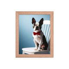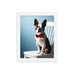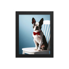 Dapper Boston Terrier in Red Bow Tie Seated on White Chair Framed poster