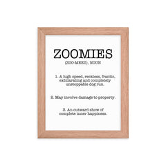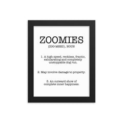 Introducing the Zoomies Definition Framed Poster, a delightful and humorous addition to any dog lover's space. This poster captures the essence of "zoomies," those moments when our furry friends unleash their inner joy and energy in a frenzy of fun. Whether you're a proud dog parent or simply appreciate the playful nature of our canine companions, this poster is sure to bring a smile to your face.